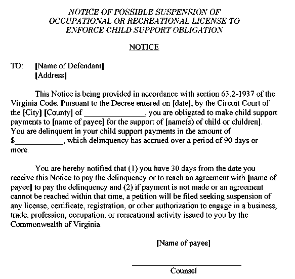 Appendix 11-8 Notice of Possible Suspension of Occupational or Recreational License to Enforce Child Support Obligation