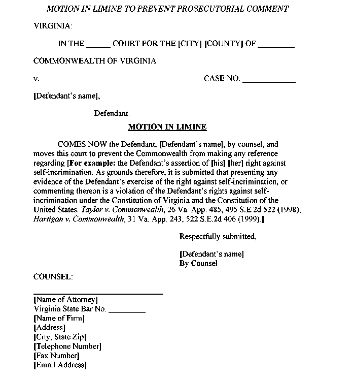 Appendix 6-1 Motion in Limine to Prevent Prosecutorial Comment