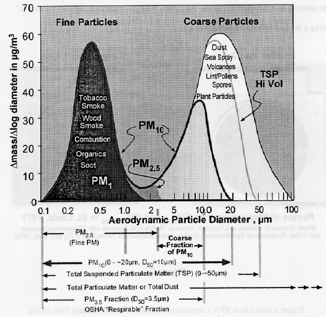 Figure 3 shows how EPA's regulatory definitions of PM, namely TSP(1970), PM10(1987), and PM2.5(1997) fit the PMfine and PMcoarse modes. The curve designated