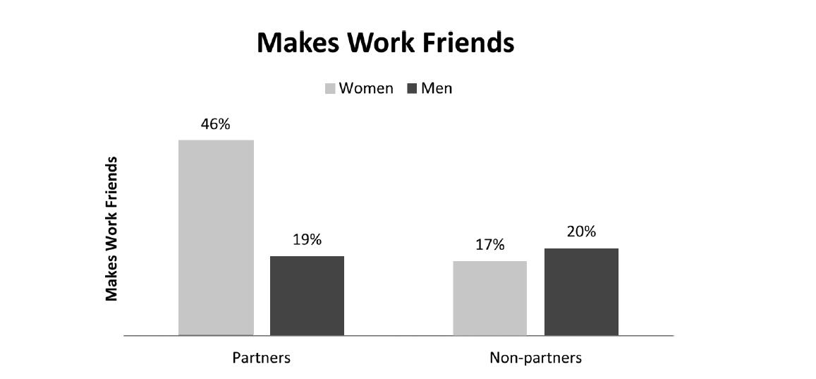 Relationships are important building blocks to success; however, as the stories above highlight, our findings suggest that women go about developing these relationships differently. Generally speaking, there is a strategic element to both male and female partners' relationship choices. Both tend to develop relationships with people who may be able to help them achieve their career goals and objectives. However, we found that women are more inclined to get involved in coworkers' lives—and that's not a bad thing. Women who make the effort to connect with colleagues in a deep, authentic way and enjoy making friends at work are the women who also make partner. While almost half of the women partners in our sample told us they make friends at work, less than 20% of women non-partners and men lawyers said the same.