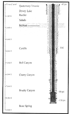 Casing strings are placed and cemented in each Delaware well to isolate the produced fluids from the Potash bearing Salado Formation (Figs. 3 and 4).
