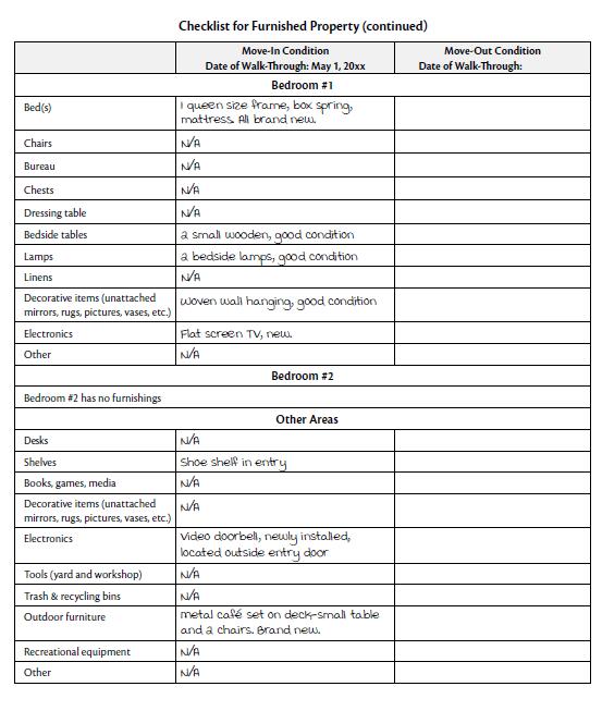 The checklist is in two parts: the General Condition of Rental Unit and Premises, and Checklist for Furnished Property. If your rental is not furnished, you can delete the second part.