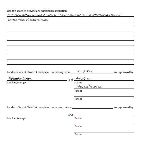 You and the tenants should fill out the checklist together. If that's impossible, complete the form and then give it to the tenants to review. The tenant should note any disagreement and return it to you within a few days.