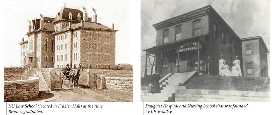 Young Bradley had only 18 total months of formal education, but in 1881 he enrolled in Lincoln Institute in Jefferson City, Missouri,[6] finishing in 1885, just in time to start law school at the University of Kansas.[7] He completed his legal studies in 1887 in Frazier Hall, where the first law school was located, graduating with honors.[8] He immediately went to Kansas City, Kansas to set up his practice at 548 Minnesota.[9] Many Exoduster families were among his clients.