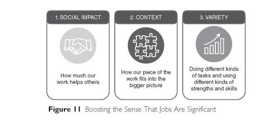 For example, a job's social impact refers to the degree to which it impacts other people. Context arises from our understanding of how our piece of the work fits into the bigger picture. Variety means that the job allows us to do different types of tasks and use different strengths and skills. All are linked to engagement through their capacity to foster meaningfulness, and each is discussed more below.